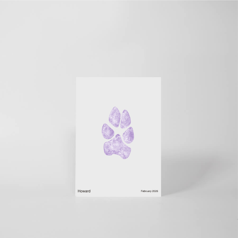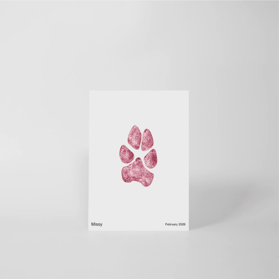 Celebrate the life of your beloved pet with a personalised memorial print, created in-house using a digital imprint of their paw, claw, or nose. This heartfelt paw print keepsake captures the unique details of your companion, turning their imprint into a timeless piece of art.