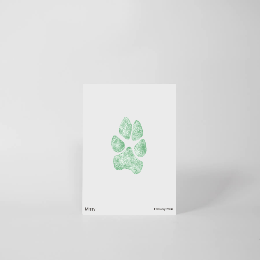 Celebrate the life of your beloved pet with a personalised memorial print, created in-house using a digital imprint of their paw, claw, or nose. This heartfelt paw print keepsake captures the unique details of your companion, turning their imprint into a timeless piece of art.